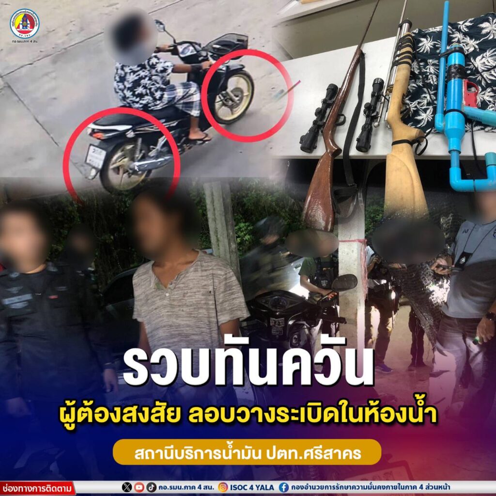 นราธิวาส – หน่วยเฉพาะกิจกรมทหารพรานที่ 49 ร่วมกับสถานีตำรวจภูธรศรีสาครบุกรวบทันควัน ผู้ต้องสงสัยลอบวางระเบิดในห้องน้ำสถานีบริการน้ำมัน ปตท. ศรีสาคร
