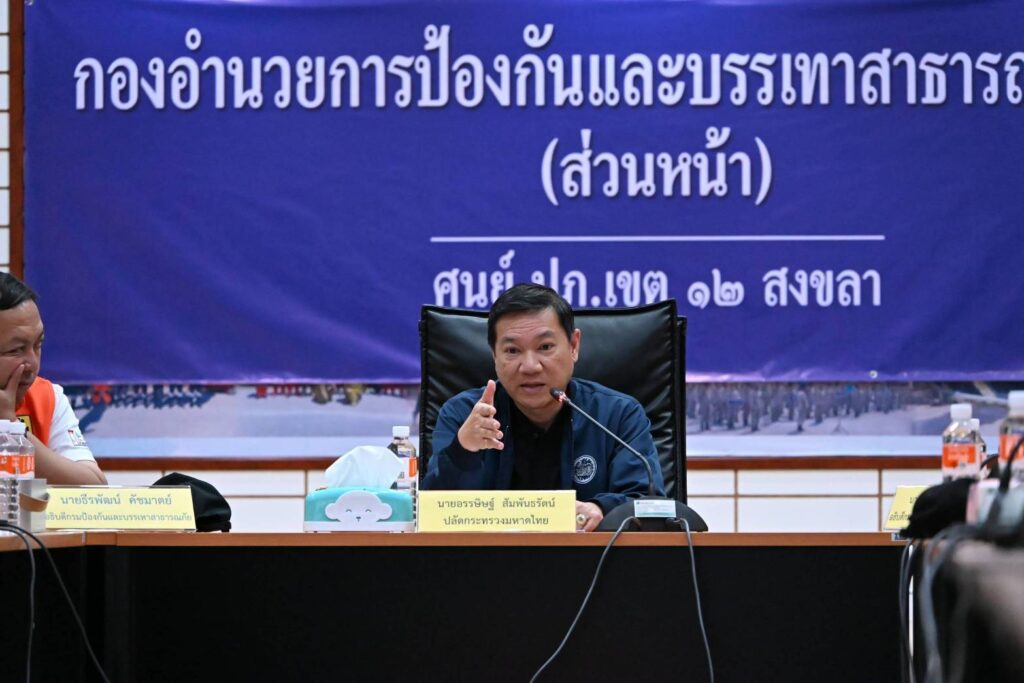 เมื่อวันที่ 27 พ.ย.568 เวลา 18.50 น.นายอรรษิษฐ์ สัมพันธรัตน์ ปลัดกระทรวงมหาดไทย เป็นประธานการประชุมติดตามเร่งรัดการช่วยเหลือฟื้นฟูผู้ประสบอุทกภัยพื้นที่อำเภอหาดใหญ่ จังหวัดสงขลา โดยมี นายธีรพัฒน์ คัชมาตย์ อธิบดีกรมป้องกันและบรรเทาสาธารณภัย นายธีรุตม์ ศุภวิบูลย์ผล อธิบดีกรมส่งเสริมการปกครองท้องถิ่น นายชัยรัตน์ แก้วเพียงเพ็ญ รองอธิบดีกรมป้องกันและบรรเทาสาธารณภัย นายชูชีพ ธรรมเพชร รองผู้ว่าราชการจังหวัดสงขลา นายเขตรัฐ ชาญศิลป์ รองผู้ว่าราชการจังหวัดสมุทรสาครช่วยราชการสำนักงานปลัดกระทรวงมหาดไทย พร้อมด้วยผู้แทนกรม หน่วยงานรัฐวิสาหกิจในสังกัดกระทรวงมหาดไทย เข้าร่วม ณ ศูนย์อำนวยการป้องกันและบรรเทาสาธารณภัยกลาง (ส่วนหน้า) ศอ.ปภ. เขต 12 สงขลา ต.ควนลัง อ.หาดใหญ่ จ.สงขลา โดยนายอำเภอ/ผู้แทน 16 อำเภอของจังหวัดสงขลา ร่วมประชุมผ่านระบบออนไลน์ในพื้นที่อำเภอ