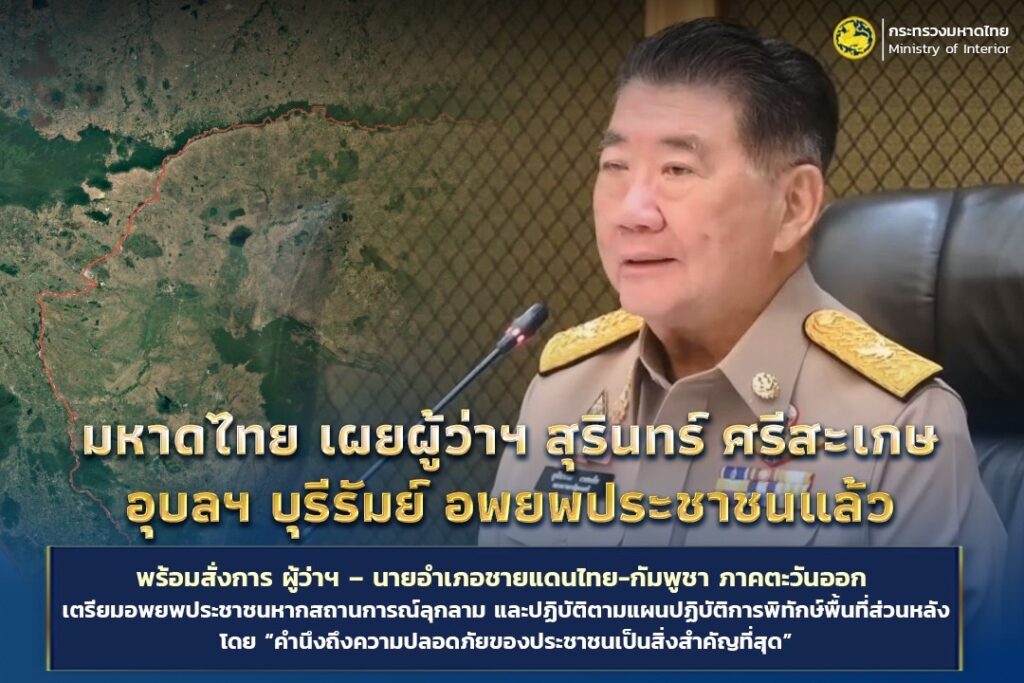 ปลัดมหาดไทยเผยผู้ว่าฯ สุรินทร์ ศรีสะเกษ อุบลฯ บุรีรัมย์ อพยพประชาชนแล้ว พร้อมสั่งการ ผู้ว่าฯ – นายอำเภอชายแดนไทย-กัมพูชา ภาคตะวันออก เตรียมอพยพประชาชนหากสถานการณ์ลุกลาม และปฏิบัติตามแผนปฏิบัติการพิทักษ์พื้นที่ส่วนหลัง โดย “คำนึงถึงความปลอดภัยของประชาชนเป็นสิ่งสำคัญที่สุด”