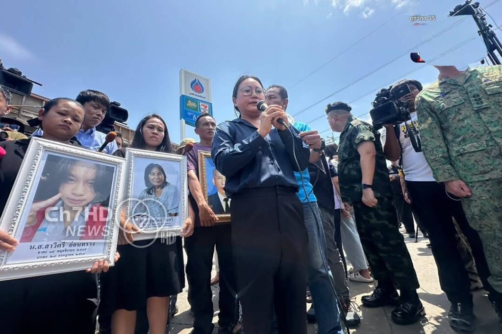 ครอบครัวผู้สูญเสียจากเหตุกองทัพกัมพูชายิงจรวด BM-21 ใส่ปั๊มน้ำมันและร้านสะดวกซื้อใน อ.กันทรลักษ์ จ.ศรีสะเกษ ถือภาพถ่ายผู้เสียชีวิต 8 ราย เรียกร้องความเป็นธรรม ขณะคณะทูต-สื่อต่างชาติลงพื้นที่