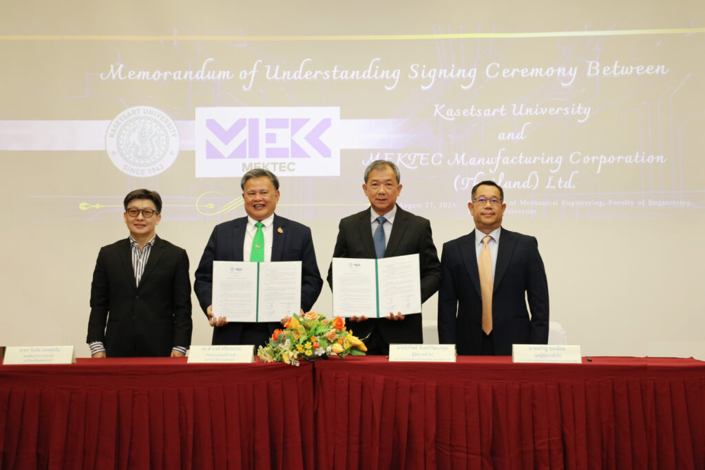 ภาควิชาวิศวกรรมเครื่องกล คณะวิศวกรรมศาสตร์ มหาวิทยาลัยเกษตรศาสตร์ เปิดตัว “MEKTEC Classroom” และลงนามความร่วมมือเชิงกลยุทธ์กับ บริษัท เม็กเท็ค แมนูแฟ็คเจอริ่ง คอร์ปอเรชั่น (ประเทศไทย) จำกัด ณ อาคาร 6 ชั้น 19 โดยมี ดร.ดำรงค์ ศรีพระราม รักษาการแทนอธิการบดี และ ศาสตราจารย์ ดร.วันชัย ยอดสุดใจ คณบดีคณะวิศวกรรมศาสตร์ ร่วมเป็นประธาน พร้อม คุณโกวิทย์ จันทร์วัฒนากุล ผู้จัดการทั่วไป และ คุณอภิรัฐ พลเยี่ยม รองผู้จัดการทั่วไป รวมถึงผู้บริหารระดับสูงจากเม็กเท็คเข้าร่วมเป็นสักขีพยานMEKTEC Classroom คือห้องเรียนต้นแบบที่ภาควิชาวิศวกรรมเครื่องกล ซึ่งนำเทคโนโลยีจากสายการผลิตจริงเข้าสู่การเรียนการสอนแบบบูรณาการ ผ่านจอข้อมูลกระบวนการและอุปกรณ์จริง ช่วยให้นิสิตฝึกวิเคราะห์ แก้ปัญหา ออกแบบนวัตกรรม และเชื่อมต่อสู่โครงงาน ฝึกงาน และการทำงานร่วมกับวิศวกรของบริษัทได้ตั้งแต่ในมหาวิทยาลัย