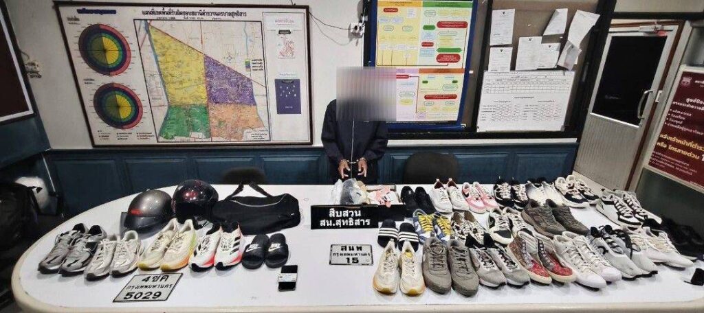 จากการตรวจสอบกล้องวงจรปิดพบว่า คนร้ายเป็นชาย 1 คน ขับขี่รถจักรยานยนต์ยี่ห้อ Yamaha รุ่น Mio สีน้ำเงิน-ขาว หมายเลขทะเบียน 4ขค 5029 กรุงเทพมหานคร เข้ามาจอดใกล้บ้านผู้เสียหาย ก่อนจะเปิดประตูรั้วเข้าไปหยิบรองเท้าแล้วขับหลบหนีไป