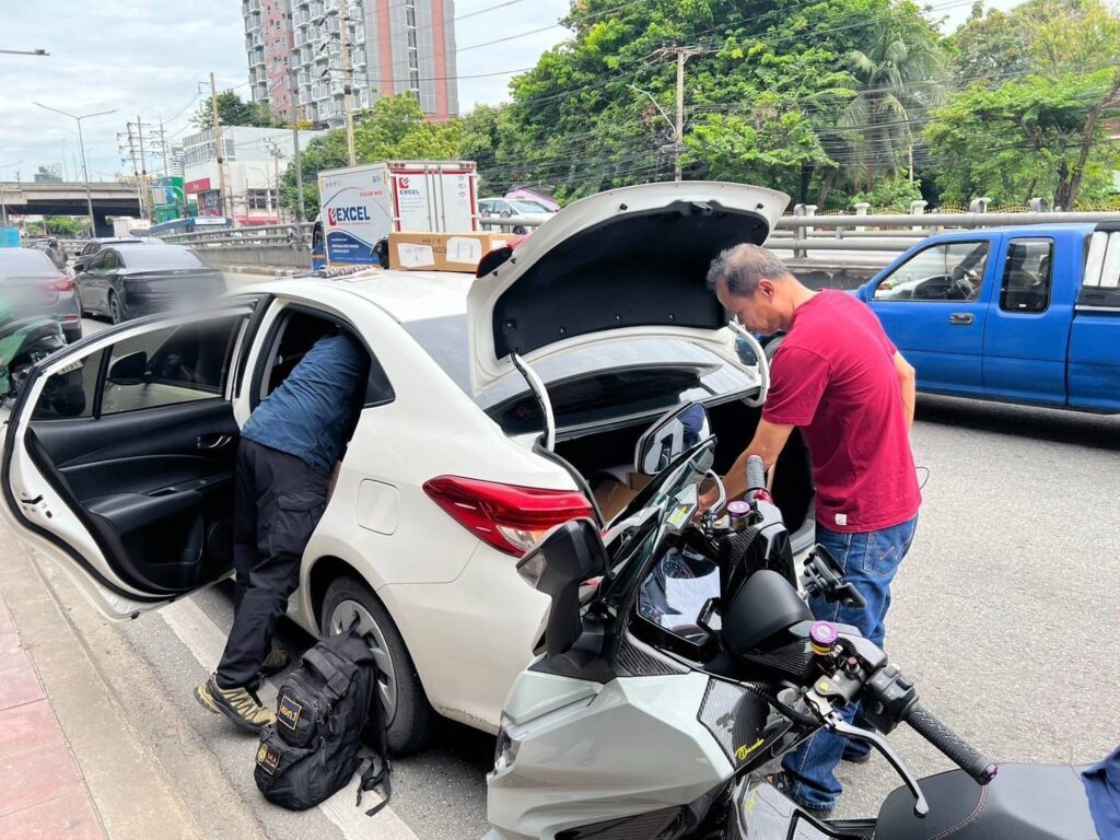 กระทั่งวันที่ 19 ส.ค.68 เวลาประมาณ 11.00 น. ได้พบรถยนต์ต้องสงสัย ยี่ห้อ Toyota รุ่น Yaris A Tive สีขาว โดยเจ้าหน้าที่ได้ตรวจพบสัญญาณคลื่นความถี่ที่ผิดปกติ เคลื่อนที่ไปพร้อมรถยนต์คันดังกล่าว จึงได้สะกดรอยติดตาม ผ่านแยกเอกมัย เข้าถนนเพชรบุรีตัดใหม่ มุ่งหน้าถนนอโศก – ดินแดง แยกประชาสงเคราะห์ และอนุสาวรีย์ชัยสมรภูมิ โดยระหว่างขับรถติดตามเจ้าหน้าที่ตำรวจชุดสะกดรอย ต่างก็ได้รับข้อความ SMS ที่แนบลิงก์เข้าสู่เว็บไซต์ปลอมเข้ามาในโทรศัพท์มือถือ  เมื่อเจ้าหน้าที่ตำรวจได้ติดตามคนร้ายมาถึงบริเวณริมถนนอโศก – ดินแดง (แยกประชาสงเคราะห์ มุ่งหน้าอนุสาวรีย์ชัยสมรภูมิ) แขวงดินแดง เขตดินแดง กทม. จึงสบโอกาศและได้แสดงตัวเข้าสกัดรถยนต์คันดังกล่าวเพื่อทำการเข้าตรวจค้น จากการตรวจค้นพบว่า ผู้ขับขี่คือ MR.DOHYONG KIM อายุ 35 ปี สัญชาติ เกาหลีใต้ เดินทางมาเพียงลำพัง