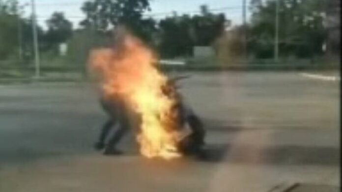 ปราจีนบุรี – เกิดเหตุการณ์ระทึก!สาวสตาร์ทรถ จยย.ไฟลุกติดพรึ่บ!ไฟไหม้ท่วมรถจยย.กลางปั้มน้ำมันพร้อมลูกสาววัย11ปีที่ซ้อนท้าย โชคดีแค่บาดเจ็บไฟไม่ลุกลาม เหตุน้ำมั่นรั่วไหลช่วงสตาร์รถจยย.กิดประกายไฟลุกพรึ่บไหม้ รถจยย.