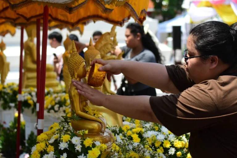 เมื่อวันที่ 14 เมษายน 2569 บรรยากาศการทำบุญในช่วงเทศกาลสงกรานต์ที่ วัดพระเชตุพนวิมลมังคลารามราชวรมหาวิหาร หรือ “วัดโพธิ์” เต็มไปด้วยความคึกคักเป็นพิเศษ ประชาชนชาวไทยและนักท่องเที่ยวต่างชาติหลั่งไหลเข้ามาอย่างต่อเนื่องตั้งแต่ช่วงเช้า ท่ามกลางแสงแดดร้อนแรง แต่ไม่อาจลดทอนแรงศรัทธาที่แผ่ซ่านไปทั่วบริเวณวัดได้