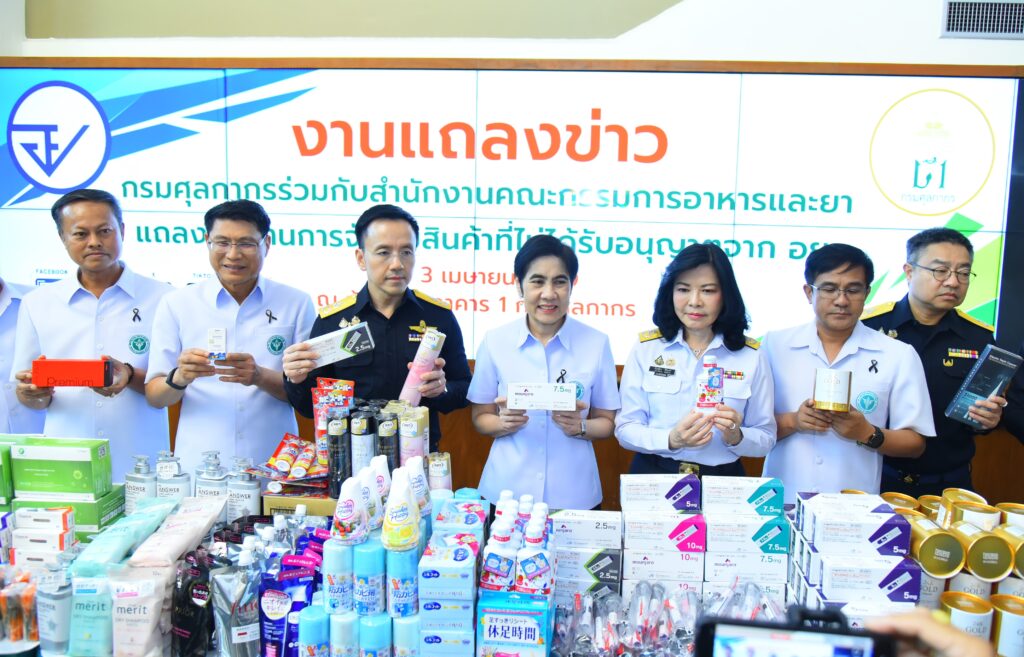 นายพันธ์ทอง ลอยกุลนันท์ อธิบดีกรมศุลกากร พร้อมด้วย เภสัชกรหญิง สุภัทรา บุญเสริม เลขาธิการคณะกรรมการอาหารและยา ร่วมแถลงข่าว ณ อาคาร 1 กรมศุลกากร เผยผลสำเร็จจากการบูรณาการความร่วมมือในการตรวจยึดสินค้าไม่ได้รับอนุญาตจาก อย. อย่างต่อเนื่อง