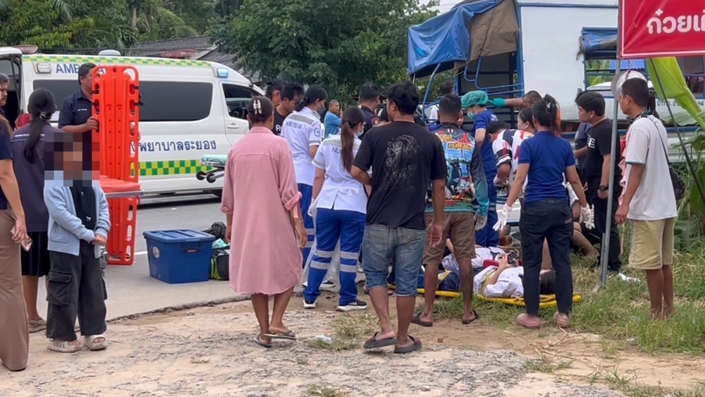 ร.ต.ท.ศตวรรศ ภูผารัตน์ รอง สว. (สอบสวน) สภ.บ้านค่าย พร้อมด้วยกู้ภัยสว่างพรฯจุดบ้านค่าย เร่งเดินทางไปยังจุดเกิดเหตุบนถนน 3143 ช่วงหน้าปากซอยมาบกะบาก ต.หนองละลอก อ.บ้านค่าย จ.ระยอง เพื่อช่วยเหลือผู้บาดเจ็บจำนวนมาก