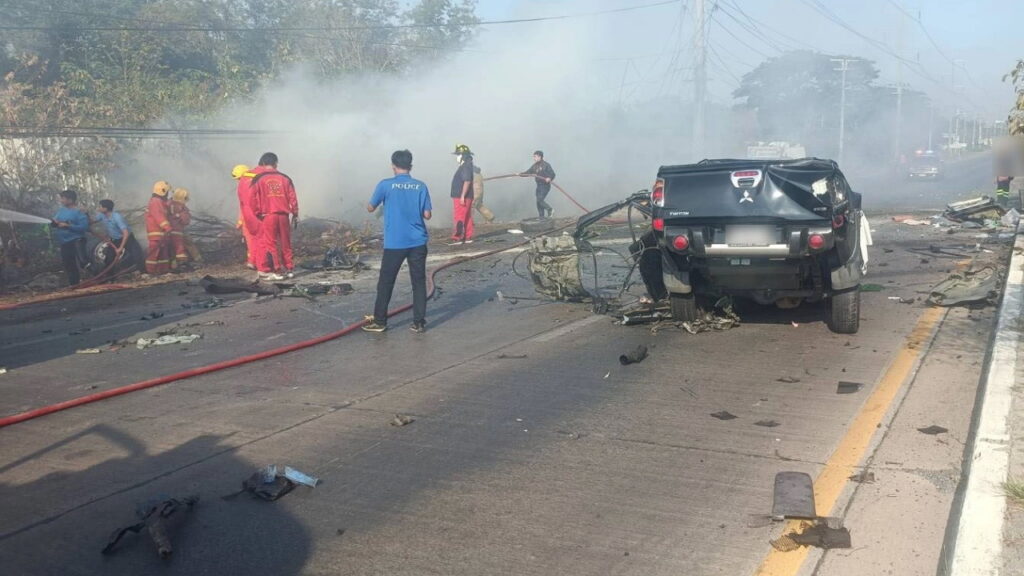 เกิดเหตุสะเทือนใจรถบรรทุกเสียหลักพุ่งข้ามเกาะชนกระบะ พ่อแม่ลูกดับ ก่อนรถตกข้างทางไฟลุกไหม้ ที่สระบุรี คนขับเจ็บ