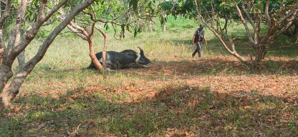 เจ้าหน้าที่หน่วยพิทักษ์อุทยานแห่งชาติเขาใหญ่ ขญ.4 (คลองปลากั้ง) ได้สนธิกำลังร่วมกับ เจ้าหน้าที่ตำรวจ สภ.วังน้ำเขียว, ฝ่ายปกครองอำเภอวังน้ำเขียว และเขตห้ามล่าสัตว์ป่าเขาแผงม้า เข้าตรวจสอบที่เกิดเหตุบริเวณพิกัด 47 P 0795420 UTM 1589802 พบร่างกระทิงเพศผู้ขนาดใหญ่ นอนตายอยู่ใกล้กับแหล่งน้ำ สภาพศพเริ่มแข็งตัว