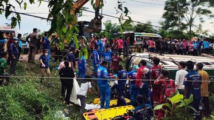 บึงกาฬ-เกิดอุบัติเหตุเศร้า รถบัสรับส่งนักเรียน เสียหลักตกถนนพลิกคว่ำ เสียชีวิตสลด 2 ราย นักเรียนบาดเจ็บอื้อเด็กนักเรียนช็อกร้องให้ระงม