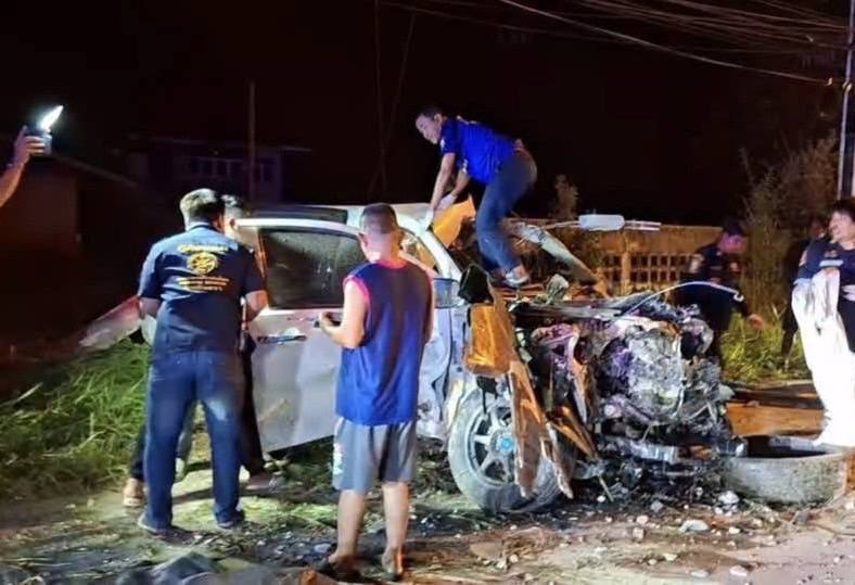 หนุ่มใหญ่วัย 36 ซิ่งกระบะเสียหลักพุ่งชนกำแพงดังสนั่นดับคาซากรถ