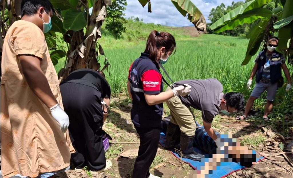 สภาพศพที่พบถูกฟันที่ศรีษะ ที่คอ ลำตัว และตัดเส้นเอ็นร้อยหวายที่ขาของผู้ตาย เมื่อเจ้าหน้าที่ตรวจสอบที่เกิดเหตุอย่างละเอียด พบคราบเลือด เส้นผมในที่เกิดเหตุ ต่อมาเจ้าหน้าที่ได้สอบถามผู้เห็นเหตุการณ์ในไร่ใกล้เคียง และได้กระจายกันออกค้นหาผู้ที่มากับผู้ตายจนกระทั่งพบคนทั้งสองเดินลึกเข้าไปจากจุดเกิดเหตุ ห่างกันประมาณ 700 เมตร จึงได้สอบถามว่ามากับผู้ตายหรือไม่ ทั้งสองรับว่ามาด้วยกัน โดยผู้ที่ลงมือก่อเหตุ ชื่อนายวัง…….. อายุ 49 ปี อยู่ชาว จ.นครศรีธรรมราช ส่วนผู้หญิงชื่อ น.ส ภา ……..อายุ 57 ปี เป็นภรรยา อยู่ อ.เมืองตาก