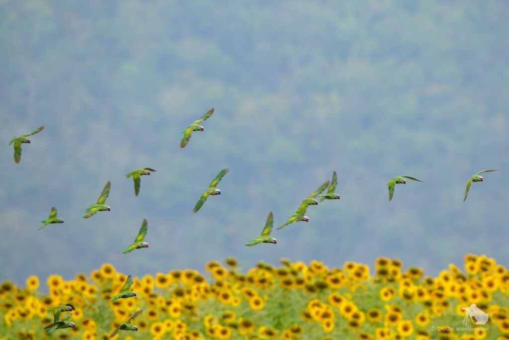 ท่องเที่ยวไทย » ตื่นตาตืนใจ!ฝูง “นกแขกเต้า” หลายพันตัว บินลงกินเมล็ดทานตะวันในไร่มณีศร