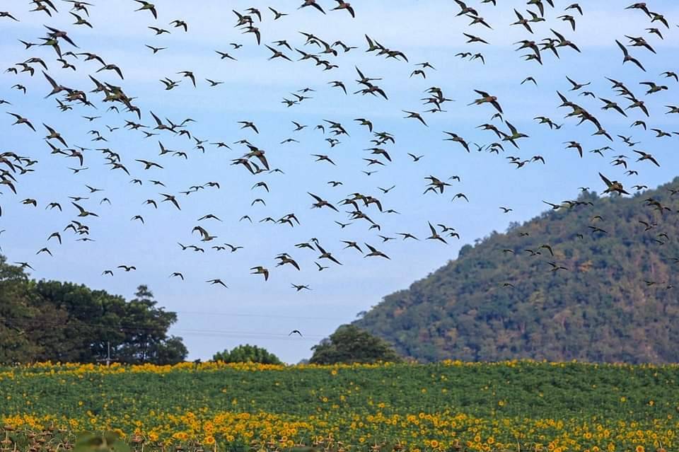 ฝูงนกแขกเต้าจากอุทยานแห่งชาติเขาใหญ่มาตามนัดพาฝูงบินมากินเมล็ดทานตะวันไร่มณีศรเขาใหญ่ทุกเข้าสร้างความตื่นตาตื่นใจให้นักท่องเที่ยว