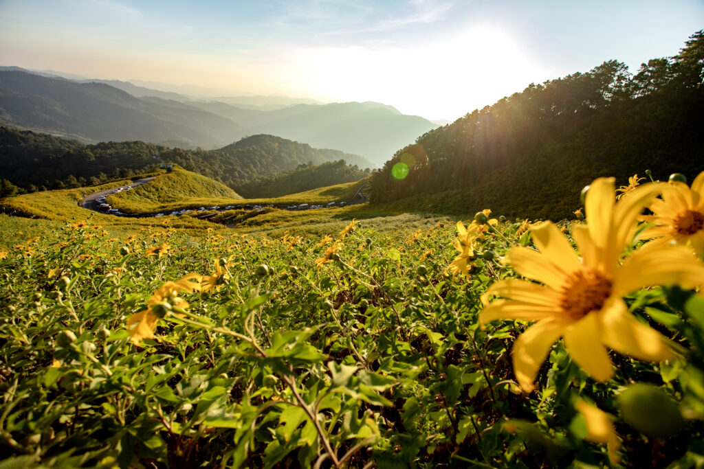 ช่วงเดือน พฤศจิกายน – ธันวาคม คือ ฤดูกาลแห่งความงามแบบเต็มพิกัด อากาศเย็นสบาย ลมพัดหอมกลิ่นหญ้า และท้องฟ้าใสเหมาะกับการถ่ายรูป ไม่ว่าจะยืนตรงมุมชมวิว หรือเดินลงไปกลางทุ่งดอกไม้ ทุกภาพที่ได้คือ “ความทรงจำสีเหลืองทอง” ที่ยากจะลืม