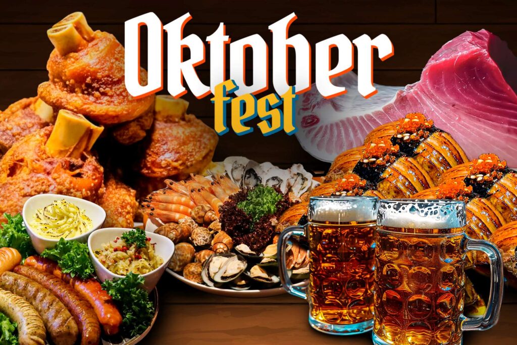 อากาศดีๆ บรรยากาศเย็นสบายเข้าฤดูหนาวแล้ว ขอเชิญชวนทุกท่านมาผ่อนคลายอิ่มอร่อยมื้อเย็น ฉลอง “เทศกาลอ็อกโทเบอร์เฟส” ตลอดเดือนตุลาคมนี้ ด้วยเมนูขาหมูเยอรมัน สารพันไส้กรอก ไก่ทอดเวียนนา กูลาซหมูใส่กะหล่ำปลีดองเสิร์ฟพร้อมมันบด ฯลฯ บริการรวมในบุฟเฟต์นานาชาติมื้อเย็นที่รวมซีฟู้ด อาทิ หอยนางรม ปูม้า หอยหวาน กุ้งแม่น้ำ และซูชิพรีเมียม อาทิ ฟัวกราส์ วากิว ปลาไหลญี่ปุ่น แซลมอน ฮามาจิ