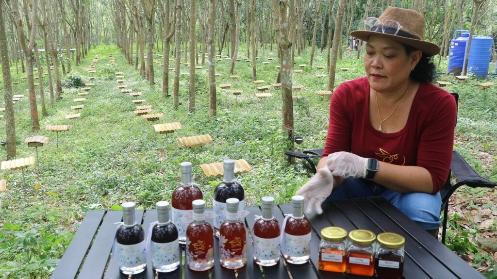 “พื้นที่เดิมที่ อ.วัดเพลง มีจำกัด เลยขยายมาที่สวนยางแห่งนี้ ซึ่งเจ้าของที่ดินเปิดโอกาสให้ทดลองเลี้ยง พอเห็นชันโรงพันธุ์พื้นถิ่นบินหากินอยู่ จึงมั่นใจว่าเลี้ยงได้” นางไพรินทร์ กล่าว