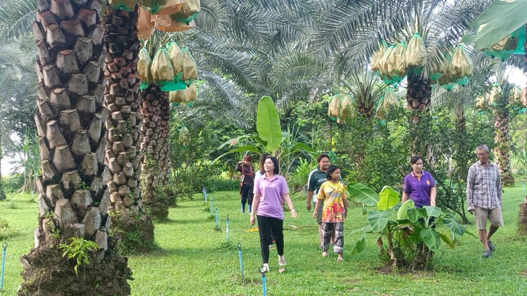 นางสาวอัมรินทร์ หรือ “แหม่ม แตงอยู่” เจ้าของสวนแบ่งเนื้อที่ 2 ไร่ ได้ปลูกอินทผาลัมสายพันธ์บาฮีแบบเนื้อเยื้อปีนี้ย่างเข้าปีที่ 10 ดูแลรดน้ำโดยวางท่อสปริงเกอร์สม่ำเสมอใส่ปุ๋ยคอกเป็นหลักพร้อมปลูกพืชผลทางการเกษตรผสมผสาน ไม่ว่าจะเป็นการปลูกกล้วย ปลูกอ้อย