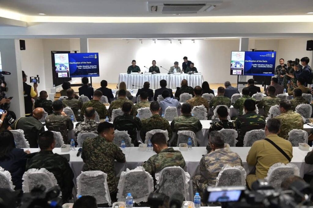 วันนี้ (ศุกร์ที่ 1 ส.ค. 2568) เวลา 10.40 น. ณ มทบ.22 ค่ายสรรพสิทธิประสงค์ จ.อุบลราชธานี นายจิรายุ ห่วงทรัพย์ โฆษกประจำสำนักนายกรัฐมนตรี คณะกรรมการศูนย์เฉพาะกิจสถานการณ์บริเวณชายแดนไทย-กัมพูชา (ศบ.ทก.) เปิดเผยว่า รัฐบาล โดย ศบ.ทก. กระทรวงกลาโหม กระทรวงการต่างประเทศ กระทรวงมหาดไทย และสำนักนายกรัฐมนตรี และกรมประชาสัมพันธ์ ได้นำคณะเอกอัครราชทูต 3 ประเทศ (บรูไน ญี่ปุ่น เมียนมา) อุปทูต 2 ประเทศ (มาเลเซีย สปป.ลาว) ผู้แทนทางการทูตระดับต่าง ๆ 6 ประเทศ (อินโดนีเซีย สหรัฐฯ สิงคโปร์ จีน เวียดนาม ฟิลิปปินส์) และทูตทหาร รวม 23 ประเทศ (อาทิ จีน มาเลเซีย ปากีสถาน เกาหลีใต้ รัสเซีย สิงคโปร์ อินเดีย แคนาดา ฝรั่งเศส สหรัฐอเมริกา ญี่ปุ่น อิตาลี เนเธอร์แลนด์ สวีเดน สวิตเซอร์แลนด์)