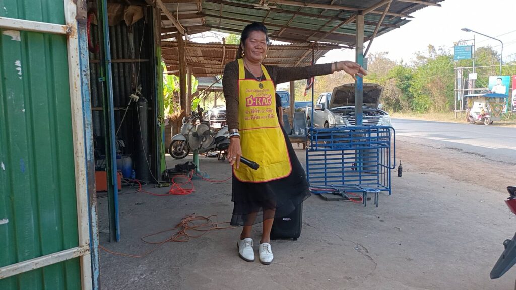 ซึ่งวันนี้ผ่านมาที่บ้านโคกสว่าง ต.ย่านรี อ.กบินทร์บุรี จ.ปราจีนบุรี ช่วงที่ได้ตระเวนขับรถผ่านหมู่บ้าน มีร้านค้ามีลูกค้านั่งอยู่จำนวนหนึ่งจึงจอดรถแล้วลากอุปกรณ์ลำโพงเคลื่อนที่ พร้อมกับใส่ชุดกระโปรงไปเปิดเพลงหมอลำขับร้องบทเพลงลูกทุ่ง,รำกลอน ให้ได้รับฟังอย่างจุใจ ใครชอบเพลงอะไรแนวไหนร้องไห้ฟังได้หมด