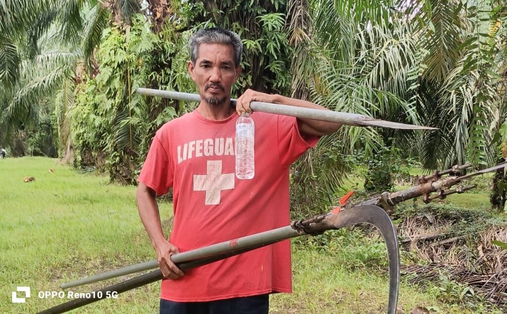 “ช่างมน บ้านหรั่ง” อาชีพผู้ช่วยผู้ใหญ่บ้านหรั่ง ต.นาเกตุ องโคกโพธิ์ และเคยทำงานเป็นนายช่วงมาก่อน ยามว่าง ปาก กัด ตีนถีบ หารายได้เสริมด้วยการมารับจ้าง “แทงปาล์ม” ในบริเวณพื้นสวนที่ใกล้ๆบ้านร่วม 5-6 ปี เขาคลุกคลีอยู่กับสวนปาล์มมานาน พอที่มองทะลุ ทะลายว่า อายุของผลปาล์มออกสีแบบไหน ที่พอเริ่มเก็บเกี่ยวไปขายได้ราคา