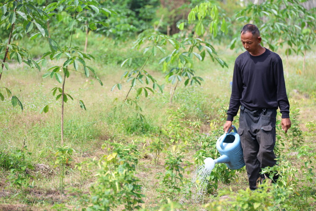 เช่น ปลูกผักไว้กินเอง ไม่ต้องซื้อ ผักเหลือก็แจกข้างบ้าน ผลผลิตมากไปก็ขายหารายเข้าครอบครัว โดยรายได้หลักได้มาจากฟาร์มฯ ตกเดือนละ 4,500 บาท (เฉลี่ย 150 บาท/ วัน) บวกกับขายพริก ข้าวโพด ไก่ที่เลี้ยงไว้ ได้อีกเดือนละ 3,000 บาท ส่วนมีเวลาว่างก็ออกไปรับจ้าง เก็บยาง ใส่ปุ๋ย ถากหญ้า รวม ๆ แล้วก็มีรายได้หลักหมื่นต่อเดือน จึงทำให้ชีวิตความเป็นอยู่ดีขึ้น