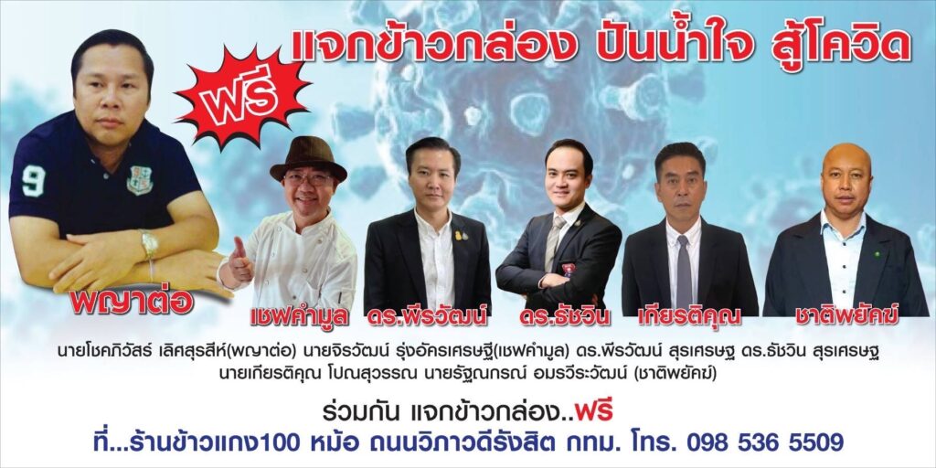 ดังนั้น”นายโชคภิวัสร์(พญาต่อ)และนายจิรวัฒน์(เชฟคำมูล)ดร.พีรวัฒน์-ดร.ธัชวิน สุรเศรษฐ, นายเกียรติคุณ(กบชุดขาว)นายกิตติพันธ์, นายรัฐณกรณ์(ชาติพยัคฆ์)นางธนาภา(ภรรยา)จึงอยากจะร่วมเป็นส่วนหนึ่งในการช่วยเหลือ กลุ่มคนที่ได้รับผลกระทบจากโรคระบาดโควิด-19 เพื่อให้ผ่านวิกฤตครั้งนี้ไปด้วยกัน.