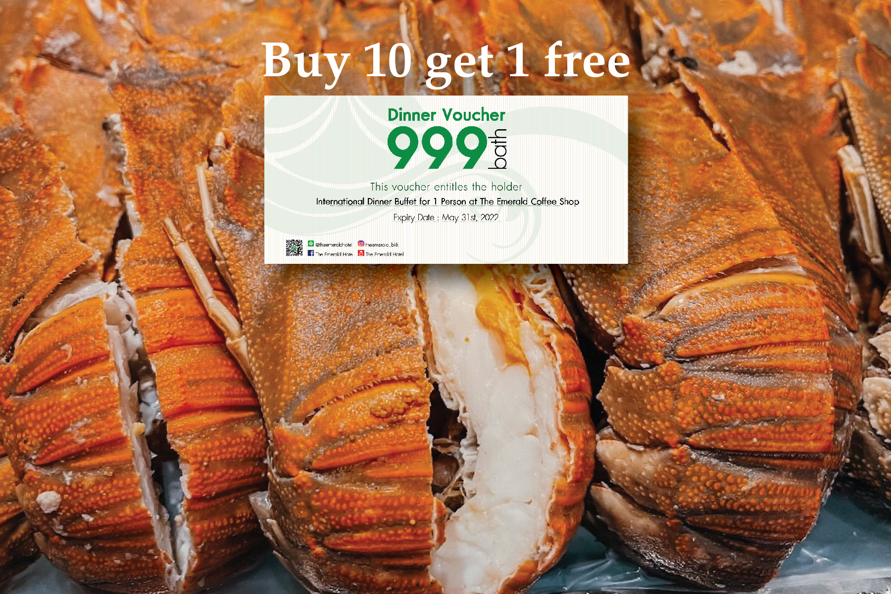 กลับมาแล้วกับบัตรบุฟเฟต์สุดคุ้มที่ทุกท่านรอคอย รับซัมเมอร์ จัดเต็มกับความอร่อยมื้อเย็นของบุฟเฟต์อาหารนานาชาติอย่างคุ้มค่า ทั้งซูชิพรีเมียม ฟัวกราส์ วากิว เทมปุระ ของห้องอาหารญี่ปุ่นไดอิจิ ซีฟู้ดออนไอซ์และแบบนึ่งร้อนทั้ง หอยนางรม กั้งกระดาน หอยหวาน กุ้งแม่น้ำ หอยแมลงภู่นิวซีแลนด์ ฯลฯ ข้าวต้มปลากะพง ขาหมูชื่อดังของดิเอมเมอรัลด์ ค็อฟฟี่ช็อพ รวมของหวานทั้งไทย-เทศ เช่น เบเกอรี่ ช็อคโกแลตฟองดูว์ บิงซู ผลไม้ตามฤดูกาล และเครื่องดื่ม เพียงใบละ 999 บาทถ้วนเท่านั้น (ราคาปกติ 1,400 บาท)