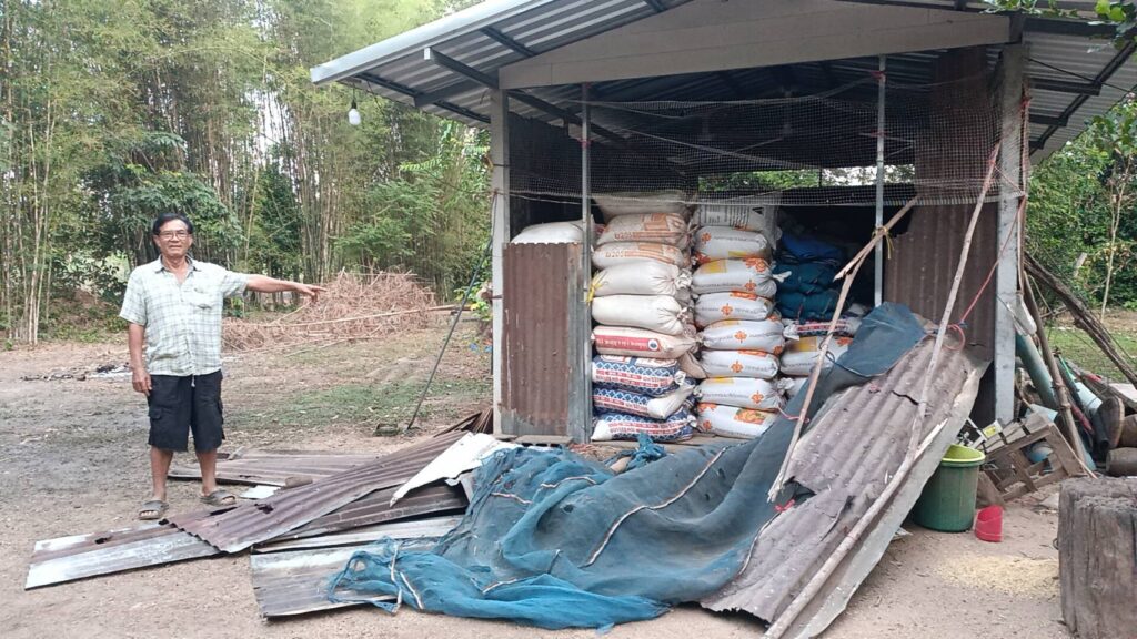 ผู้สื่อข่าวได้ลงพื้นที่ไปยังบ้านเลขที่หลังดังกล่าว ซึ่งเป็นบ้านของนายบุญเรือง กุลยาอ้น อายุ 69 ปี อยู่บ้านเลขที่ 67/1 หมู่ที่ 7 ข้างบ้านหลังดังกล่าวเป็นยุ้งฉางปลูกติดดินข้าวหลังคามุงกับฝามุงด้วยสังกะสี บริเวณด้านหน้ายุ้งข้าวพังเสียหายและมีถุงปุ๋ยที่ใส่ข้าวเปลือกอยู่ในยุ้งกองอยู่ด้านในซึ่งเป็นข้าวเปลือกเก่า200 กระสอบปุ๋ยข้าวเปลือกใหม่อีกเกือบ200กระสอบปุ๋ยบริเวณด้านหน้าพบถุงปุ๋ยที่ใส่ข้าวเปลือกถูกลากออกมาบริเวณด้านนอกเมล็ดข้าวเปลือกกระจัดกระจายเกลื่อนพื้น