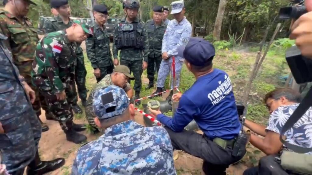 คณะผู้สังเกตการณ์ชั่วคราว IOT เห็นของจริง ทุ่นระเบิดใหม่ของกัมพูชาที่ไทยเก็บกู้ได้พื้นที่ภูมะเขือ เป็นระเบิดสังหารบุคคล 46 ทุ่น ยังไม่ทำงาน 16 ทุ่น